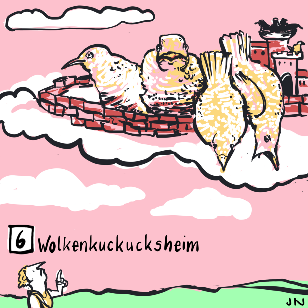 ✴ Auf Englisch wurde daraus „cloud cuckoo land” mit der Redewendung „live in cloud cuckoo land”. Die Person, die dort lebt, ist ein „cloud cuckoo lander”. (Und wie wäre das auf Deutsch? Viel Spaß bei der Übersetzungsknoblerei! 😉)