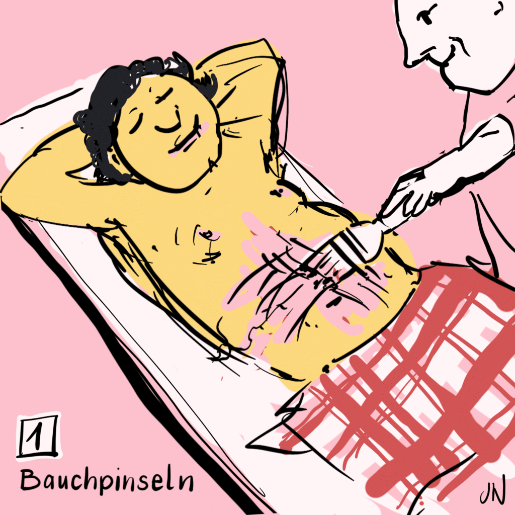 ✴ „Bauchkitzeln“ als Synonym für „bauchpinseln“ entstand womöglich parallel zu „Gaumenkitzel“ (für „Gaumenfreude“) – im Bauch sollten Gefühle und Intuition sitzen, so glaubte man. Auf jeden Fall erzeugt das Streichen mit dem Pinsel angenehme Gefühle.